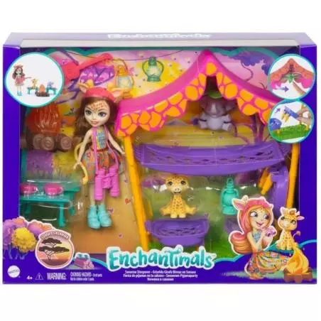 Zestaw do zabawy Enchantimals Biwak na sawannie jest pełen elementów inspirujących do opowiadania własnych historyjek. Przysiądź na ławeczce przy ognisku, aby spędzić wesoło czas w stylu Enchantimals dzięki takim akcesoriom jak gitara, kubeczki, latarenka i nie tylko. A potem połóż się w namiocie i śnij słodko o przygodach na sawannie. Lalka Griselda Giraffe może się ułożyć na hamaku pod liściastym obracającym się wiatrakiem. Jej przyjaciele żyrafka Antenna i słonik Stompah też mają swoje łóżeczka. Dzieci pokochają wyjątkową więź, jaka łączy bohaterów ze świata Enchantimals! Kolory i elementy dekoracyjne mogą się różnić.