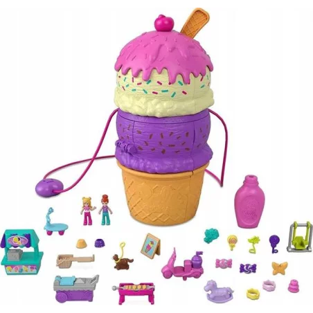 - Zestaw Zakręcone niespodzianki Lody Plac zabaw ma kształt rożka lodowego, a po otwarciu pokrywki odsłania 3 poziomy zabawy.