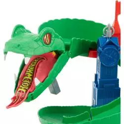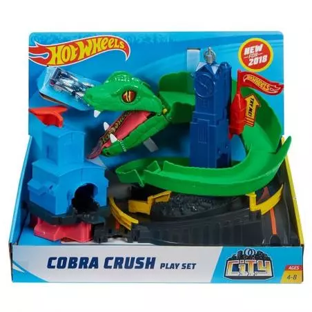 Podejmij wyzwanie i uratuj miasto Hot Wheels przed Gigantyczną Kobrą Gigantyczna Kobra atakuje miasto! Porwała Twoich przyjaciół! Możesz stanąć do walki z Kobrą! Wystrzel samochód i spróbuj przeskoczyć nad łbem węża, robiąc unik przed jadowitym ukąszeniem! Ratunku! Samochód utknął w paszczy potwora! Wystrzel kolejny samochód i uwolnij swojego towarzysza. Przekręć głowę kobry, aby zmienić sposób zabawy. Spróbuj przelecieć nad głową gada i naciśnij spust w dolnej części ogona, aby pokonać bestię. Pokonana Kobra opada NA DÓŁ! Wyrzutnia jest zabawnie stylizowana na stację kolejową. Zestaw łączy się z innymi zestawami Hot Wheels City za pomocą nowego systemu i jest kompatybilny z pomarańczowym torem. Zestaw zawiera jeden pojazd Hot Wheels. ?Łatwe resetowanie: wystarczy pociągnąć flagę!