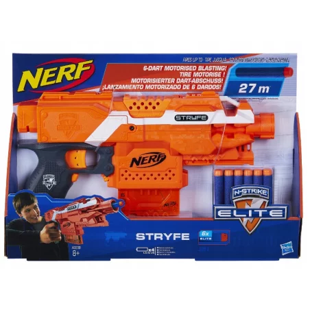 Wystrzelaj cały swój magazynek w strone celu! Z miotaczem typu Nerf Stryfe mozesz razic przeciwnika 6 Elitarnymi Strzałkami na odległosc az 27 metrów! Dzieki specjalnemu spustowi mozesz strzelac jeszcze szybciej, a ulepszony magazynek zmienia sie na pełen w mgnieniu oka!