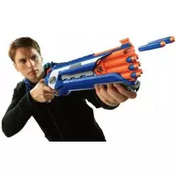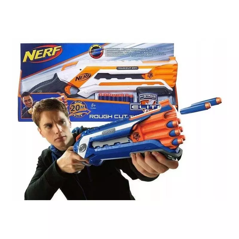 Nerf N-Strike - Wyrzutnia Rough Cut Elite A1691. Wyrzutnia Rough Cut wystrzeliwuje równocześnie dwie strzałki bez dodatkowego załadunku. To jej niewątpliwa zaleta. Ponadto wyglądem przypomina dubeltówkę. Wyposażona została w 8 strzałek dla czterech podwójnych strzałów. Zasięg strzału wynosi aż 20 metrów! Wymaga przeładowania po oddaniu 2 wystrzałów. Strzałki do wyrzutni ładujemy od strony lufy. Przeładowanie następuje w klasyczny sposób - należy przesunąć uchwyt na lufie do przodu, a następnie do tyłu. Dodatkowo Rough Cut posiada szynę taktyczną oraz dwa uchwyty na pasek.