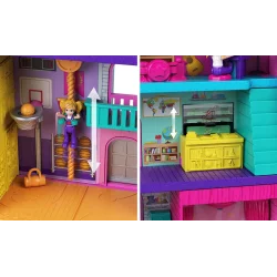 Otwórz i rozłóż zestaw, aby zobaczyć 3 poziomy i 7 obszarów zabawy, mikrolalki Polly i Nicolas oraz 12 mikroakcesoriów, które można umieścić w dowolnym miejscu (takich jak torba, gitara, mikrofon, sztaluga, płótno, piłka do koszykówki, biurko, stolik do stołówki, 2 krzesła szkolne,