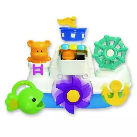 - kiedy dziecko naleje kubkiem w kształcie rybki wodę do gniazda bocianiego, to pod jej ciśnieniem zacznie się kręcić koło łopatkowe, a spod pokładu wyłoni się miś