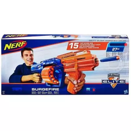 Nerf N-Strike - Wyrzutnia Surgefire E0011. Poznaj wyjątkową wyrzutnię, działającą z niezwykłą prędkością. Rotacyjny bęben pracuje nie tylko szybko, ale także cicho. Zasięg wyrzutni sięga nawet do 27 m. W magazynku znajduje się aż 15 strzałek, dzięki czemu to Ty poczujesz satysfakcję przewagi nad przeciwnikiem. Wyrzutnia Nerf Elite
