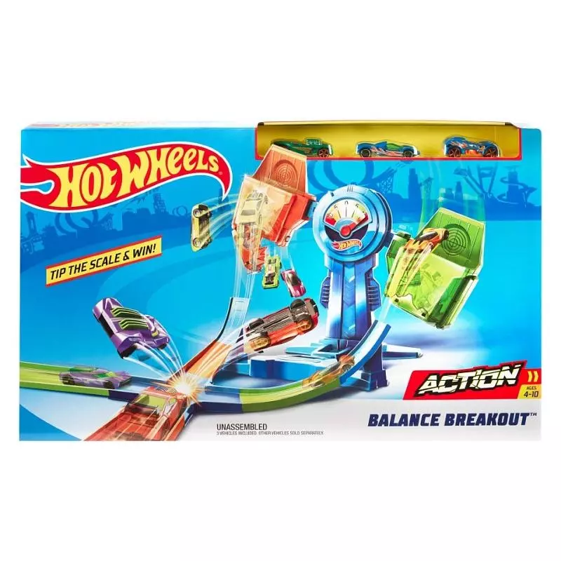 - zestaw do zabawy Hot Wheels® Waga Zwycięstwa z 3 samochodami – Podejmij wyzwanie! Ten zestaw torów Hot Wheels® pozwala na szaloną przygodę. Dzieci wystrzeliwują w kierunku wagi swoje autka i trafiają do kolorowych pojemników, usiłując wysypać samochody rywala! Baw się w trybie dla 2 graczy i ucz się zasad fair play