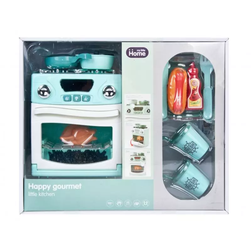 Można tu znaleźć płytę z dwoma polami grzejnymi, kurki do sterowania kuchenką są ruchome. Zawartość zestawu kuchenka, garnek z pokrywką, patelnia, 2 x kubki na napój, hot-dog, butelka ketchupu, sztućce.