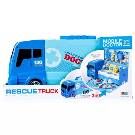 Całość zapakowana w poręczną walizeczkę w kształcie Auta. Zawartość zestawu: stetoskop, okulary, nożyczki, termometr, lusterko, ciśnieniomierz, umywalka z kranem oraz pudełeczka z lekami.