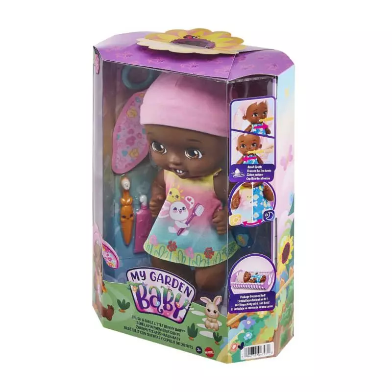 Mięciutka czapeczka z uszkami, urocze detale i słodki zapach kwiatów sprawiają, że zajmowanie się tym bobaskiem to sama przyjemność. Gdy szczotkujesz ząbki maluszka szczoteczką, główka lalki przekręca się na boki. Ubrany w strój 2-w1 (sukienka i koszulka nocna) bobasek jest gotowy na cały dzień pełen zabawy, a potem słodką drzemkę. Opakowanie staje się łóżeczkiem, aby bobasek-króliczek mógł odpłynąć w krainę słodkich snów. Dzieci pokochają zajmowanie się tymi uroczymi bobaskami My Garden Baby™.