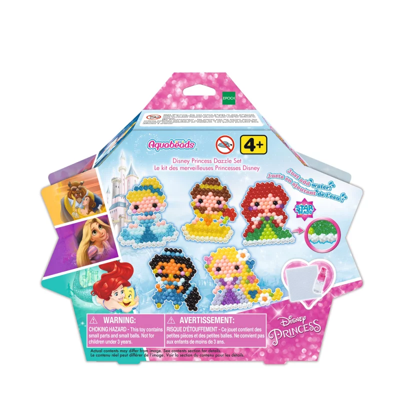 Gotowy do zabawy Olśniewający zestaw Disney Princess Auabeads zawiera ponad 800 barwnych koralików, podstawkę do układania, spryskiwacz oraz szablony z kreacjami.