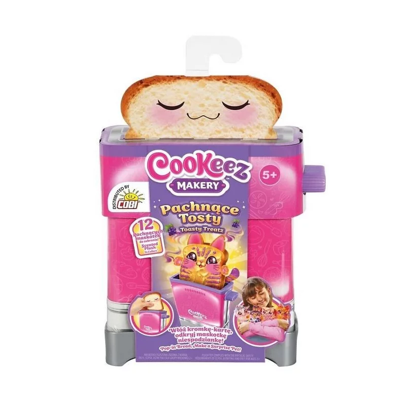 Który niespodziewany pluszowy przyjaciel wyskoczy z tostera Cookeez Makery Toasty Treatz? Twoje dziecko nie uwierzy, jaki słodko pachnący smakołyk zaraz spotka! Najpierw włóż chleb do gniazda tostera, a następnie przesuń uchwyt tostera w dół. Teraz przesuń uchwyt z powrotem do góry, aby odsłonić najsłodszego niespodziankowego pluszowego zwierzaka Toasty Treatz! Toasty Treatz to miękkie, pulchne i pysznie pachnące kolekcjonerskie pluszowe zwierzaki w kształcie uroczych śniadaniowych przysmaków! Który z nich wyskoczy?