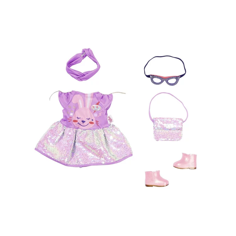 Niebieska maska może być noszona jako okulary na opasce lub stanowić element stylizacji sukienki dla Królika Benno. W końcu króliczek też lubi się bawić. Sukienka posiada spódnicę wykonaną z cekinów zmieniających kolor. Torebka BABY born jest również ozdobiona błyszczącymi cekinami. Na głowie ma opaskę o szczególnie modnym kroju. Różowe botki uzupełniają strój urodzinowy.
