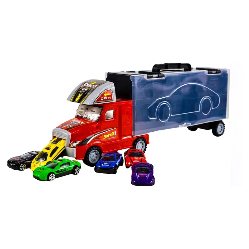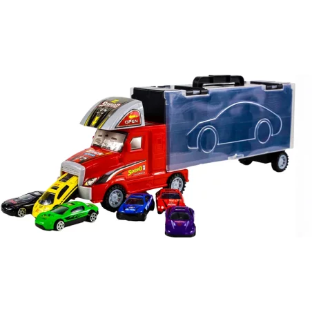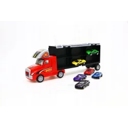 Zawartość opakowania: - 1 duża laweta, - 6 małych samochodzików wyścigowych.