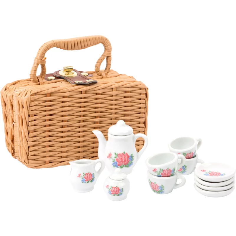 Pleciony koszyk został pięknie wykonany, jest zamykany za pomocą oczka i wyściełany materiałem w biało-czerwoną kratkę. Wewnątrz koszyczka znajduje się serwis wykonany z prawdziwej porcelany w którego skład wchodzą: imbryczek z przykrywką, cukierniczka z przykrywką 4 filiżaneczki, 4 talerzyki oraz dzbanek na mleko. Naczynia umieszczone są na plastikowych podkładkach. Na każdym z nich znajduje się zdobienie z różą. Idealnie nada się na piknik w towarzystwie ulubionych lalek.