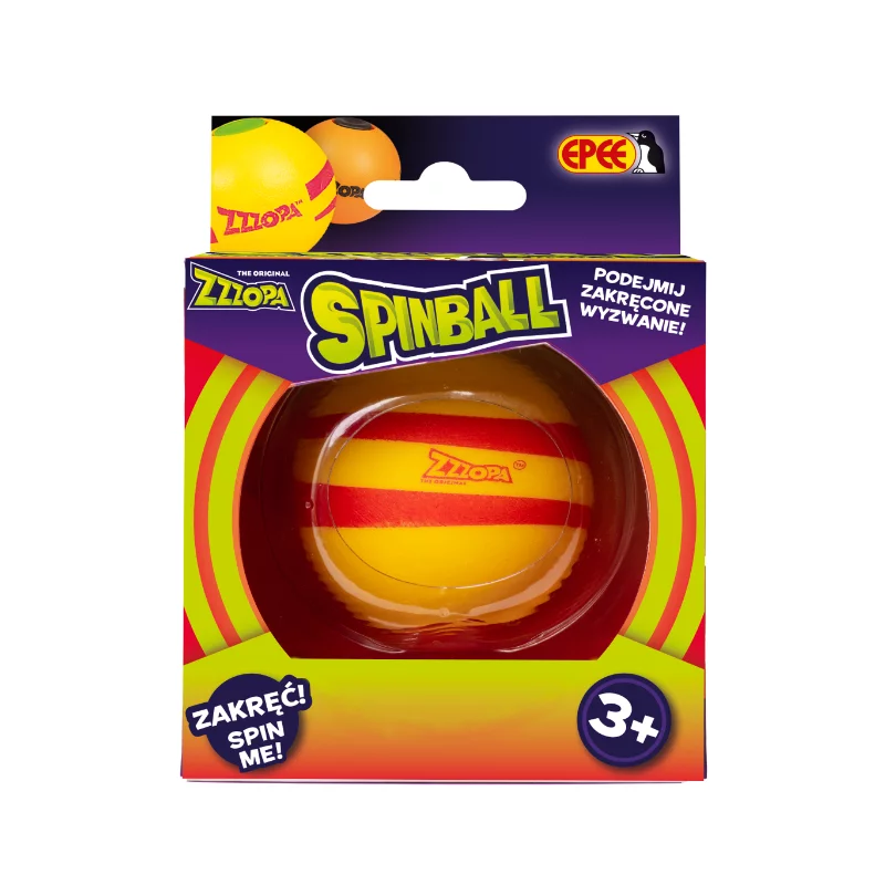 Kręcąca się piłeczka do wykonywania trików działająca na zasadzie podobnej do fidget spinnera od EPEE. Możemy położyć piłeczkę na kciuku, próbować nią zakręcić i utrzymać na palcu. Jej powierzchnia jest wykonana z materiału, który zapewnia łatwe odbijanie się od podłoża. Piłeczka nadaje się do rzucania i toczenia. Możemy najpierw nadać jej rotację, trzymając za nieruchome elementy na jej biegunach, a później rzucić do wybranego celu. Wzór, jaki znajduje się na piłeczce to czerwone paski na pomarańczowym tle. Gdy zabawka się kręci, paski tworzą ciekawy efekt wizualny (wir). Piłeczka długo utrzymuje swoją rotację dzięki zastosowaniu specjalnej, potrójnej technologii.