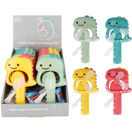 Wiatraczek (dinozaur) z ruchomym spustem, którym wprawiamy w ruch skrzydła. Posiada uśmiechniętą buzię oraz wyżłobienia na grzbiecie. Wytłoczono też na nim gwiazdki i serduszka. Wprawione w ruch dwa skrzydełka wiatraka są w stanie nas ochłodzić. Zabawka jest poręczna. Zmieści się do torebki. Produkt występuje w różnych wariantach