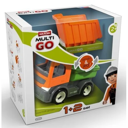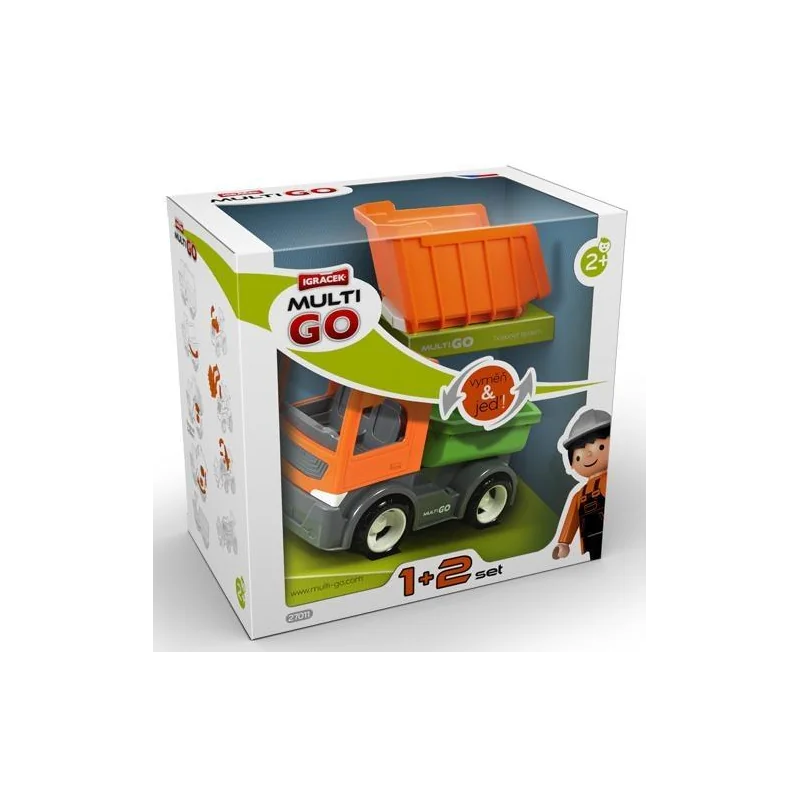Bazą zabawek MultiGO stanowi nadwozie auta, z wymiennymi rozszerzaniami. Połączenie między nadwoziem a rozszerzeniem jest stabilne i bezpieczne. Śmieciarka może na chwilę zmienić się w cysternę lub wywrotkę.