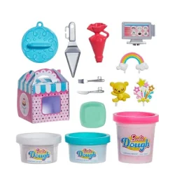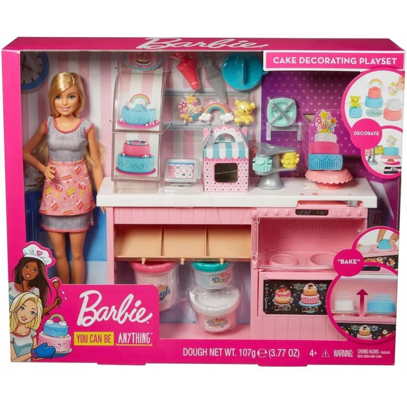 Lalka Barbie pomoże dzieciom zrobić "ciasto: i udekorować je za pomocą wyjątkowych akcesoriów do wypieków! Ten kreatywny zestaw to idealny przepis na zabawę - zawiera trzy pojemniki z masą plastyczną w kolorze różowym, niebieskim oraz białym z dodatkiem konfetti, dzięki której można tworzyć własne "pyszności". Wyspa kuchenna jest podzielona na trzy części, w których dzieci mogą "piec", dekorować i prezentować swoje ciasta. Jest tam również miejsce na ponad 10 akcesoriów dołączonych do zestawu. W zestawie lalka cukiernik Barbie w modnych stroju, wyspa kuchenna z "piekarnikiem", w którym "wyrasta" ciasto, witrynka, trzy pojemniki z masą plastyczną Barbie, narzędzie do dekorowania ciast z trzema szablonami, trzy ozdoby do ciast, podstawka, rękaw cukierniczy, kasa, łopatka, talerzyk, sztućce i pudełko na ciasto. Lalka nie stoi samodzielnie.
