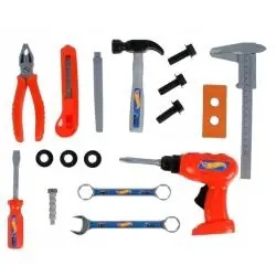 Zestaw narzędzi Hot Wheels to marzenie każdego młodego majsterkowicza. Poczuj się jak prawdziwy mechanik! Wiertarka ma opcję wiercenia za pomocą przycisku. Zestaw zawiera: wiertarka, klucz nastawny, 2 klucze francuskie, młotek, śrubokręt, 2 deseczki, nożyk do tapet, oraz śrubka. Materiał: plastik. Wymiary opakowania: 29 x 30,5 x 8 cm Zestaw nie