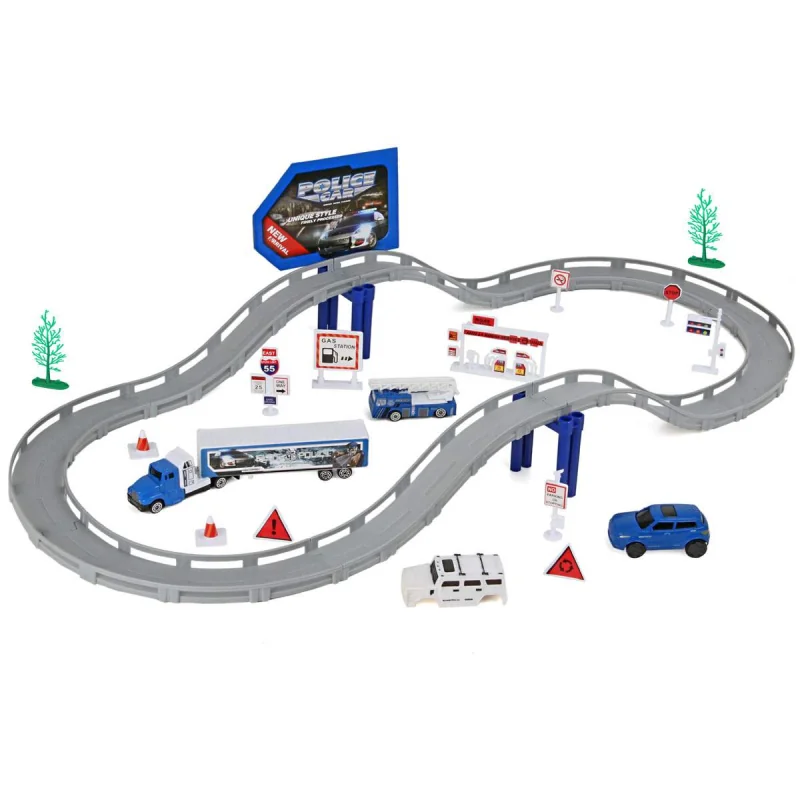 W zestawie: droga,drzewka,stacja benzynowa,pachołki,znaki drogowe oraz pojazdy-ciężarówka z odejmowaną naczepą,pojazd z podnoszonym koszem,karoseria terenówki i pojazd terenowy z napędem na baterie