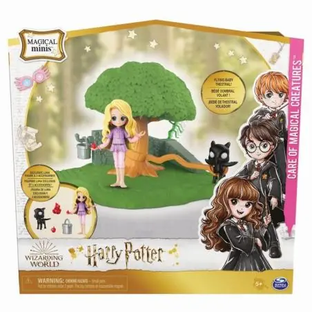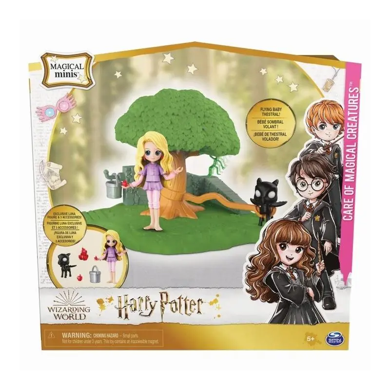 Dzięki wyjątkowej 3-calowej lalce Luny Lovegood i trzem tematycznym akcesoriom (w tym mały, latający Testral) młode czarownice, czarodzieje i mugole mogą odtwarzać ulubione sceny z Harry'ego Pottera. Przymocuj małego Testrala do drzewa i pozwól mu latać dookoła! Następnie zdejmij wiadro z haczyka i nakarm magiczne zwierzę jabłkami – Luna może je brać do ręki. Następnie znajdź stworzenie ukrywające się pomiędzy liśćmi. Przesuń lunę nad miejscem aktywacji, żeby na drzewie pojawiły się Nieśmiałki. Ten zestaw to doskonały sposób pobudzenia wyobraźni poprzez ekscytującą zabawę. Połącz go z zamkiem Hogwart Magical Minis (sprzedawany oddzielnie) i rozszerz o klasę zaklęć oraz eliksirów (zestawy z lalkami są sprzedawane osobno).