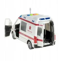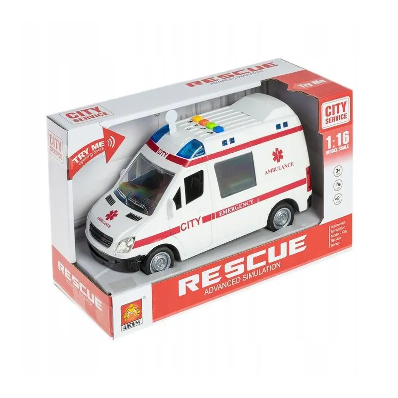 Otwarte kolorowe pudełko przekazuje wszystkie najważniejsze informacje dotyczące zabawki. Chłopcy uwielbiają bawić się samochodami. Najlepsze są takie, które odzwierciedlają w detalach prawdziwe pojazdy. Karetka to pojazd, który zainteresuje każde dziecko. Migające światła, odgłosy klaksonu, silnika pozwolą odtwarzać akcje ratunkowe i bawić się w bohaterów dnia - lekarzy.