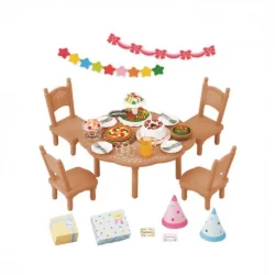 Stolik, krzesełka, tort, ciasto, girlandy, czapeczki, prezenty... kolorowo, odlotowo szykuje się w Sylvanii! Wszystko gotowe na wspaniałe przyjęcie urodzinowe dla dzieciaków w leśnej krainie!