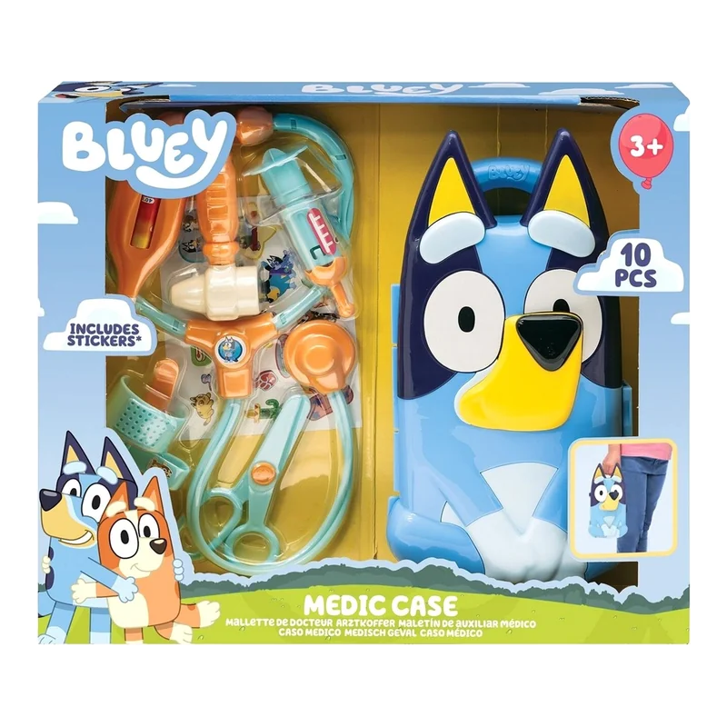 W skład zestawu wchodzi twarda walizka w kształcie ulubionego bohatera, Bluey, oraz dziewięć akcesoriów medycznych, które umożliwią pełną zabawę w lekarza. Dzieci znajdą w nim: stetoskop, termometr, otoskop, strzykawkę, nożyczki, lustro, bandaż oraz przydatne narzędzie do zabiegów. Zestaw pozwoli na symulowanie różnych sytuacji medycznych, od codziennych kontroli zdrowotnych po bardziej kreatywne scenariusze związane z pomocą dla ulubionych zabawek.
