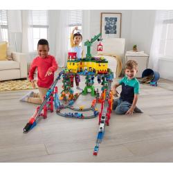 Teraz dzieci mogą wyruszyć w fascynującą przygodę z Tomkiem i jego przyjaciółmi, kreując świat swojej zabawy na nieskończenie wiele sposobów. Zestaw jest kompatybilny z liniami Adventures, TrackMaster™, MINIS i Wooden Railway. Wielosystemowa Megastacja z aż trzema poziomami zabawy zawiera następujące pojazdy: Tomka (TrackMaster™), Piotrusia (Tomek i Przyjaciele Adventures), Kubę (MINIS) i Harolda. Zestaw jest nie tylko dostosowany do większości pociągów z linii Tomek i Przyjaciele, ale można go też przebudować według różnych konfiguracji, dzięki czemu pasuje do różnych przestrzeni w domu. Wystarczy, że odłączysz poszczególne filary, a zestaw doskonale wpasuje się w mniejsze przestrzenie. Pomieści nawet 100 pociągów i składa się z torów o łącznej długości 10 metrów, włączając także znane miejsca takie jak Domkowo, Rybkowo, Grodkowo, Warsztat Parowozów, Maszynownię, Kamieniołom pod Niebieską Górą i Lądowisko Harolda. Zestaw zawiera również m.in. elementy ładunkowe, elementy umożliwiające połączenie z innymi zestawami do zabawy, dwa tory wyścigowe i poziom do zabawy na podłodze. To prawdziwe pole do rozwinięcia dziecięcej wyobraźni i kreatywności! Uwielbiany przez najmłodszych dodatek to dźwig Karolek z żurawiem, który można unosić, obniżać i podłączać do specjalnego wyciągu służącego do podnoszenia ładunku, a nawet pociągów. Obrotnica i dźwignia umożliwia z kolei zatrzymanie pojazdów TrackMaster™, podczas gdy Twój Mały Maszynista postanowi zmienić kierunek. W filarach i na stacjach znajdują się tunele. Jest również miejsce na składowanie ładunku. Dodatkowe pociągi i zestawy są sprzedawane oddzielnie w zależności od dostępności. To jeden z najlepszych i najbardziej fascynujących zestawów do zabawy z serii Tomek i Przyjaciele!