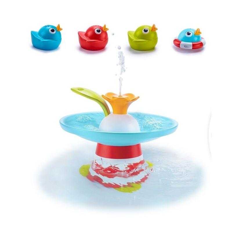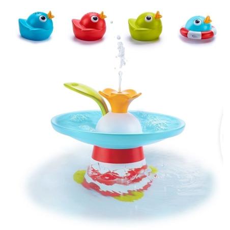 Aby pomóc dziecku zapoznać się z zabawką, proponujemy wspólną zabawę rodzica z dzieckiem za pierwszym razem. Przymocuj fontannędo płaskiej powierzchni na dnie wanny, zabezpiecz wszystkie trzy przyssawki, upewniając się, że fontanna jest wypoziomowana. Napełnij wannę wodą. Poziom wody musi wynosić 4-14 cm. Włącz zabawkę przyciskiem on/off umieszczonym na zielonym listku. Ustaw kaczuszki na torze wodnym, obserwując jak gonią za sobą wokół fontanny. Zachęć dziecko do chwytania kaczuszek, wyjmowania i wkładania z powrotem do wody. Zapytaj dziecko o kolory lub cyfry, znajdujące się na kaczuszkach. Każda z kaczuszek może być ustawiona na samej górze fontanny, dając różne efekty wodne.