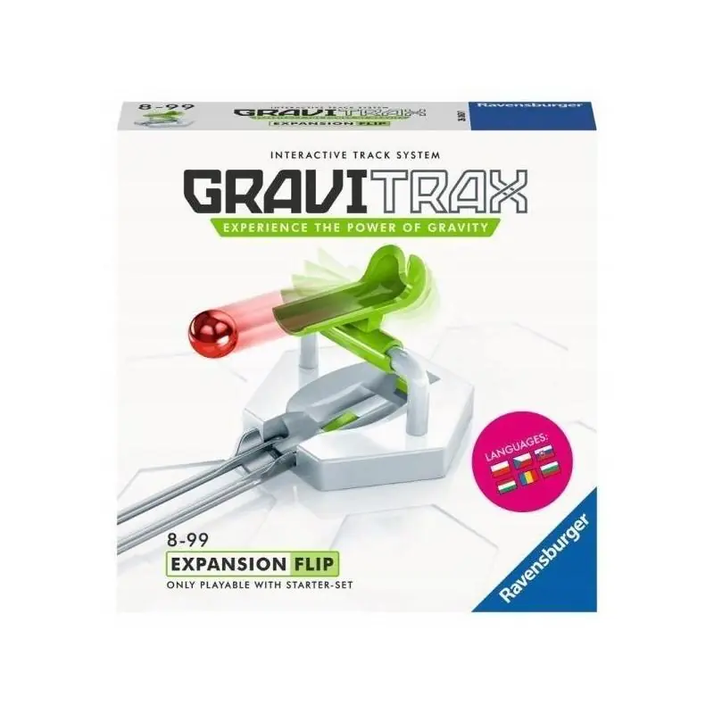 GraviTrax Flip to dodatkowy element akcji do popularnego systemu torów kulkowych Ravensburger. Dzięki niemu kulki mogą w spektakularny sposób zmieniać kierunek o 180° i wspinać się w górę, co dodaje dynamiki i jeszcze więcej emocji podczas zabawy. Zestaw ten wymaga posiadania zestawu