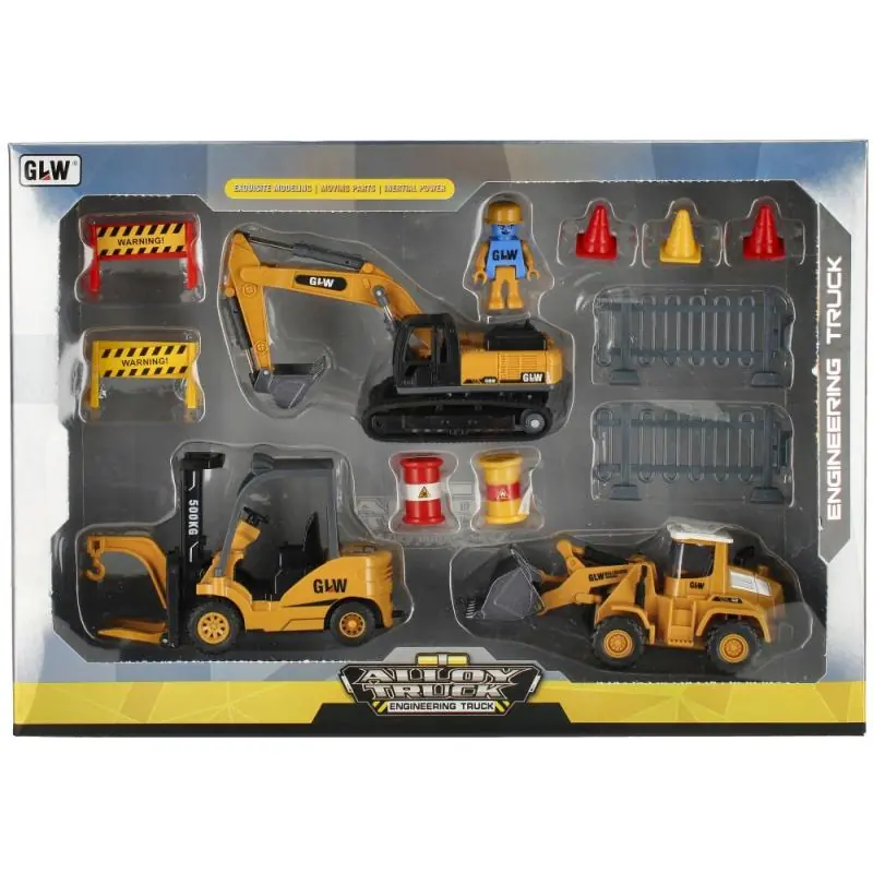 W zestawie znajdują się trzy maszyny budowlane – dwie koparki oraz wózek widłowy z funkcją dźwigu. Pojazdy wykonane są w większości z metalu, dzięki czemu są trwałe i odporne na intensywną zabawę.