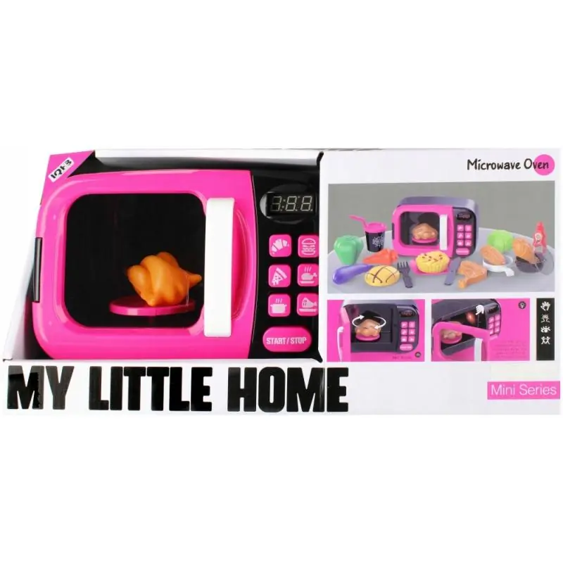Zestaw zawiera mikrofalówkę, imitację upieczonego kurczaka oraz akcesoria do gotowania.
