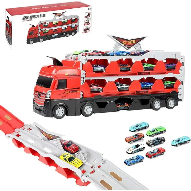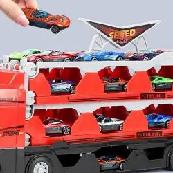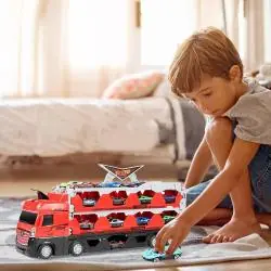 W zestawie znajduje się ciężarówka z 3-poziomową lawetą, funkcja toru z katapultą oraz 6 autek resoraków.