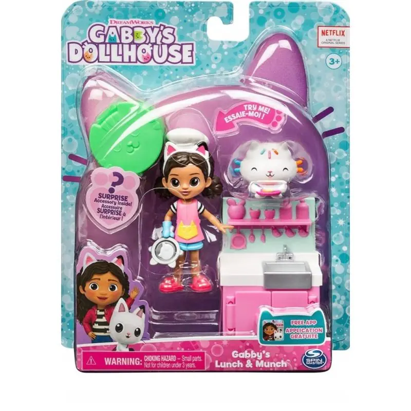Gabby’s Dollhouse Koci Domek Gabi zestaw lunch to uroczy zestaw z figurką Gabi i akcesoriami kuchennymi, który pozwala dzieciom odtwarzać sceny z popularnego serialu. Dzięki szczegółowemu wykonaniu i dodatkom zabawa staje się jeszcze bardziej kreatywna i angażująca.