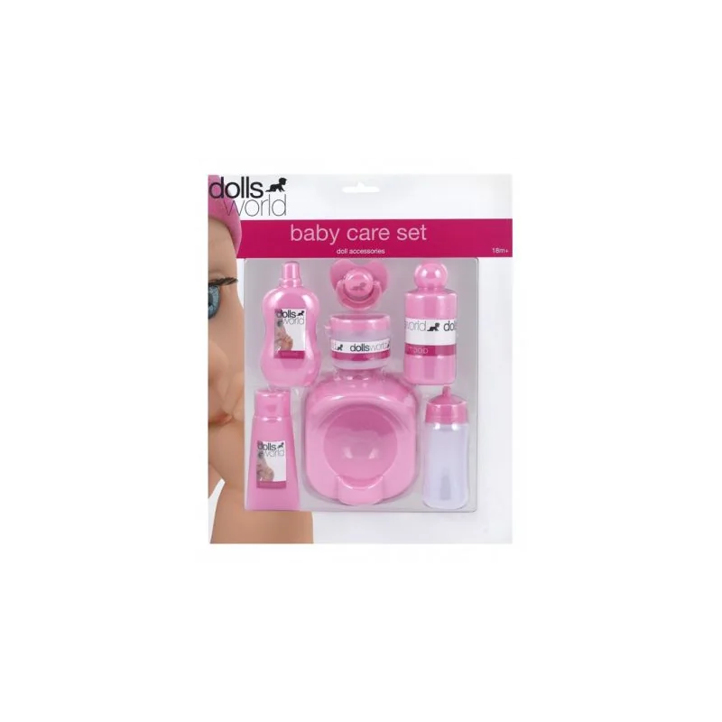 Akcesoria Baby Care Set Dolls World 18m+ to zestaw do zabawy w opiekę nad lalką, przygotowany z myślą o dzieciach od 18 miesiąca życia. Produkt wspiera rozwój wyobraźni, empatii i umiejętności społecznych, zachęcając malucha do naśladowania codziennych czynności opiekuńczych. To praktyczny dodatek do zabawy lalkami, który pomaga tworzyć
