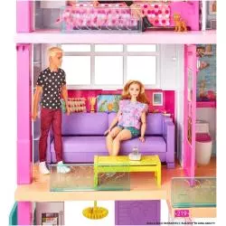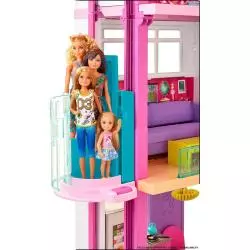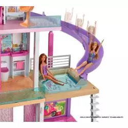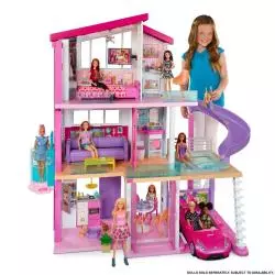 Domek dla lalek Barbie zachwyca swymi rozmiarami i ilością pokoi! Ma aż 90 cm wysokości, 3 poziomy i aż 8 różnych pomieszczeń, które są umeblowane! To mnóstwo przestrzeni do zabawy swoimi lalkami! W domku znajduje się garaż, jadalnia, kuchnia, salon, łazienka, taras z basenem, sypialnia i gabinet. Ponadto z 3. piętra na taras z basenem Twoje lalki mogą zjechać zjeżdżalnią, a żeby przemieścić się z parteru na najwyższy poziom mogą użyć windy, w której zmieszczą się aż 4 lalki!