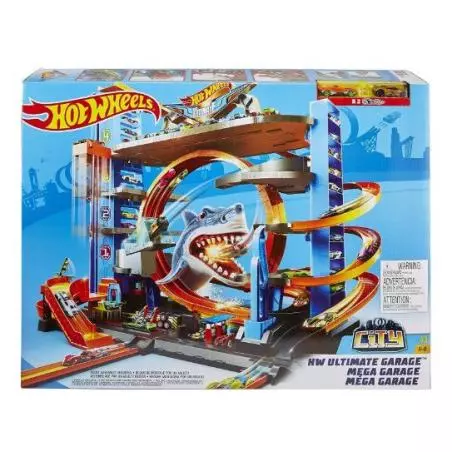 Mega garaż Rekina pozwoli dzieciom na ekscytującą zabawę! Garaż mieści nawet 90 pojazdów i ma podwójny, duży tor z pętlą i atakującym rekinem! Za pomocą windy szybko dostaniesz się samochodzikiem na najwyższe piętro, by zjechać po ekstremalnym torze z wyrzutnią i wielką paszczą rekina! Ale trzeba uważać na zderzenia - każde autko