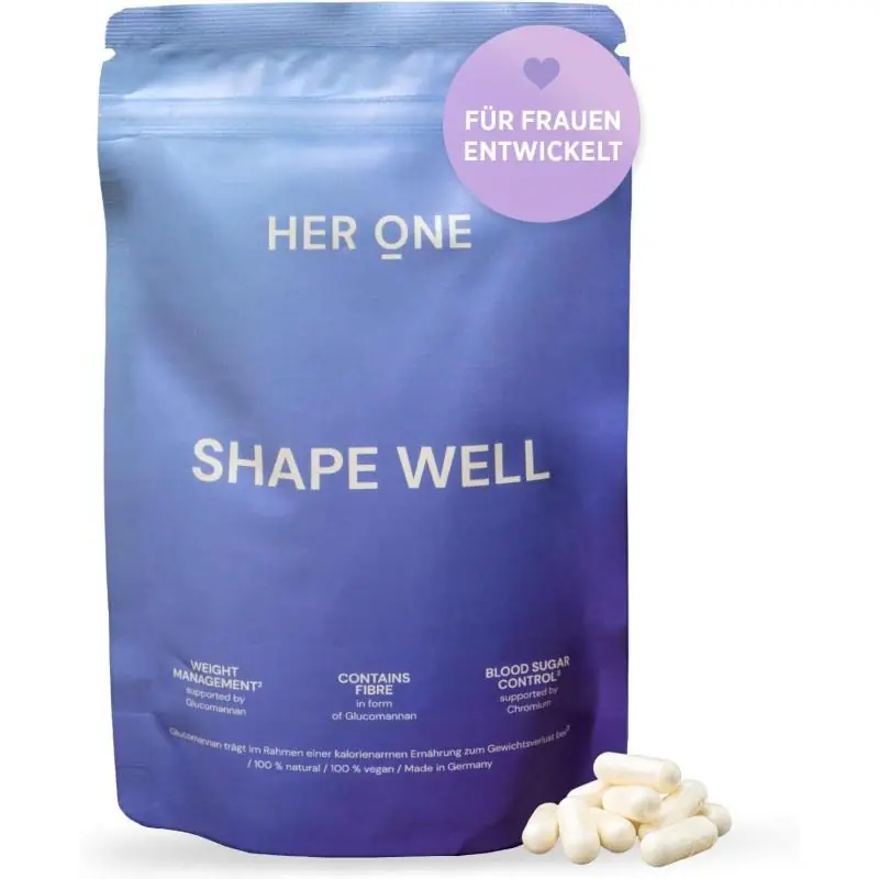HER ONE Shape Well to suplement diety w kapsułkach, opracowany z myślą o kontroli masy ciała oraz utrzymaniu prawidłowego poziomu cukru we krwi. Formuła oparta na glukomannanie z korzenia konjac oraz chromie wspiera uczucie sytości, pomaga ograniczyć apetyt i jednocześnie dba o prawidłowe funkcjonowanie jelit. Produkt jest wegański, bezglutenowy