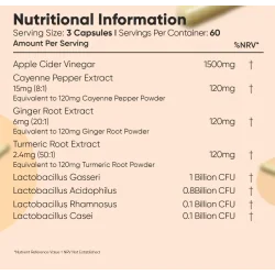 Skład kluczowy: ocet jabłkowy, pieprz cayenne, imbir, kurkuma, probiotyki Lactobacillus