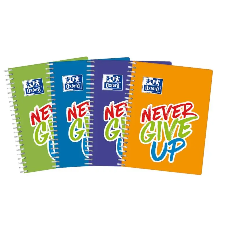 Kołozeszyt A4 80 kartek w kratkę Never Give Up Oxford to funkcjonalny zeszyt do szkoły, biura i codziennego użytku. Wytrzymałe kartki, praktyczny format A4 i spiralne wiązanie zapewniają wygodę pisania, notowania i rysowania, a motywacyjny napis „Never Give Up”