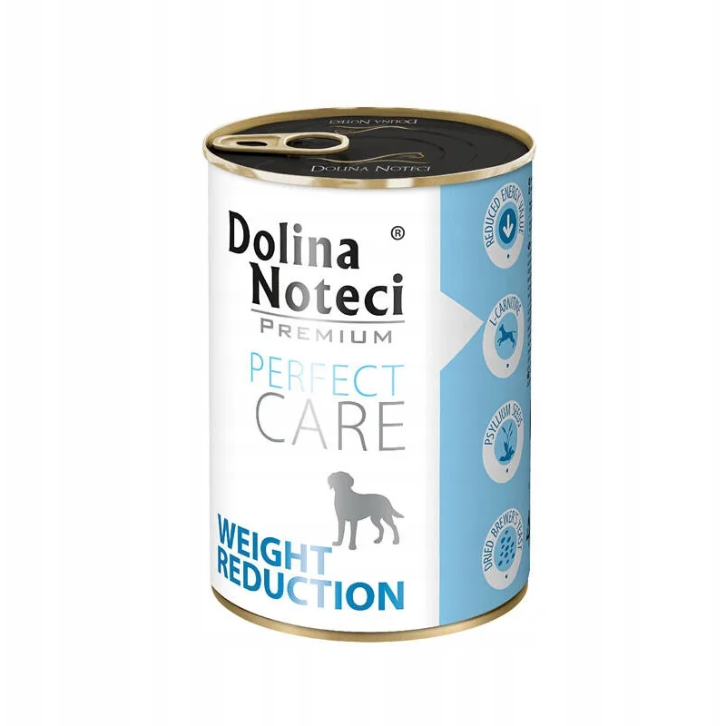 Dolina Noteci Perfect Care Weight Reduction mokra karma dla psa 400g to specjalistyczna karma dietetyczna opracowana, aby wspierać redukcję masy ciała u psów z nadwagą lub skłonnościami do przybierania na wadze. Zbilansowana receptura dostarcza niezbędnych