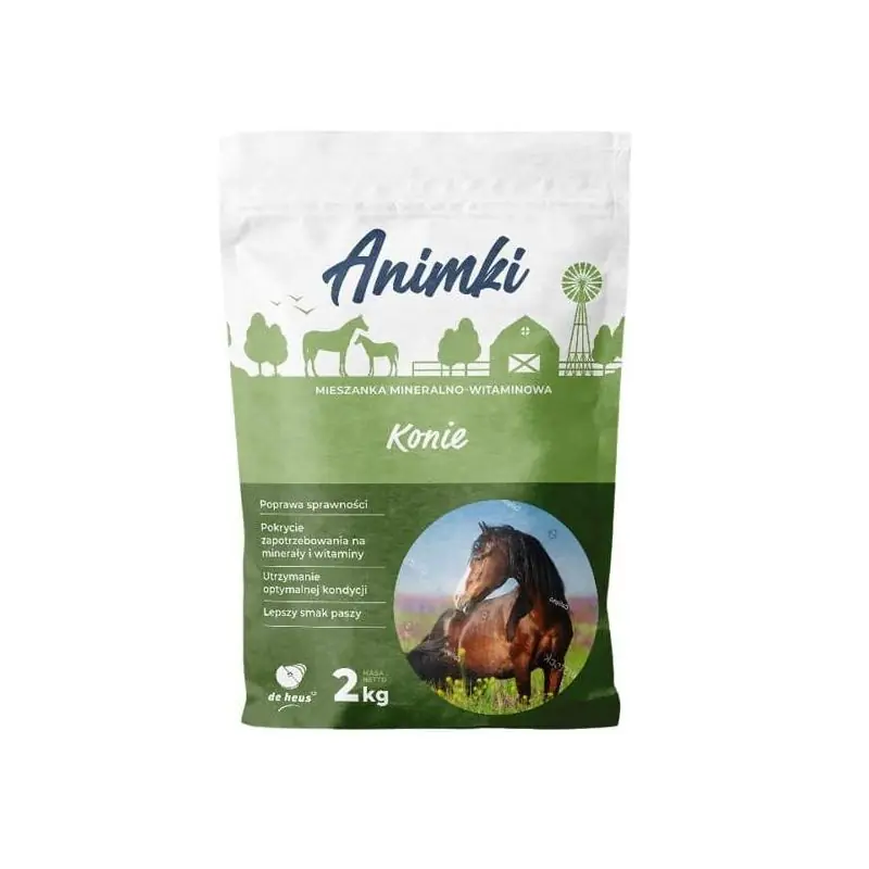 Animki Witaminy i Minerały dla Koni 2 kg to wysokiej jakości mieszanka mineralno-witaminowa stworzona z myślą o koniach hodowlanych, rekreacyjnych, sportowych i wyścigowych. Odpowiednio zbilansowane składniki wspierają kondycję zwierzęcia, jego odporność, prawidłowy rozwój kości oraz optymalną pracę układu mięśniowego i