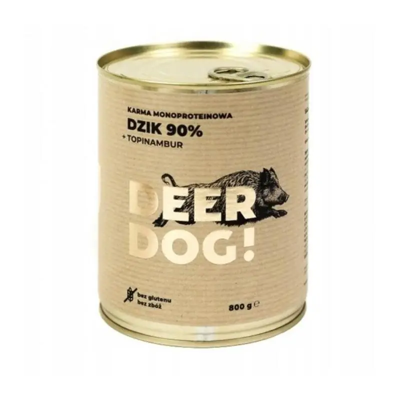 Mokra karma dla psa Deer Dog Dzik + Topinambur 800 g to pełnoporcjowe, naturalne pożywienie stworzone z myślą o zdrowiu i wysokiej przyswajalności. Aż 90% mięsa z dzika w składzie gwarantuje doskonałe źródło białka, a monoproteinowa receptura idealnie sprawdza się u psów wrażliwych i alergików. Bezzbożowa, bezglutenowa formuła bez
