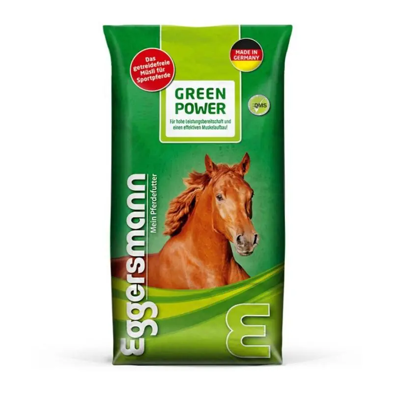 Wybierz Green Power Getreidefrei EGGERSMANN, jeśli szukasz bezzbożowej paszy o wysokiej wartości odżywczej, która wspiera formę konia w treningu i ułatwia kontrolę skrobi oraz cukrów w codziennej diecie.